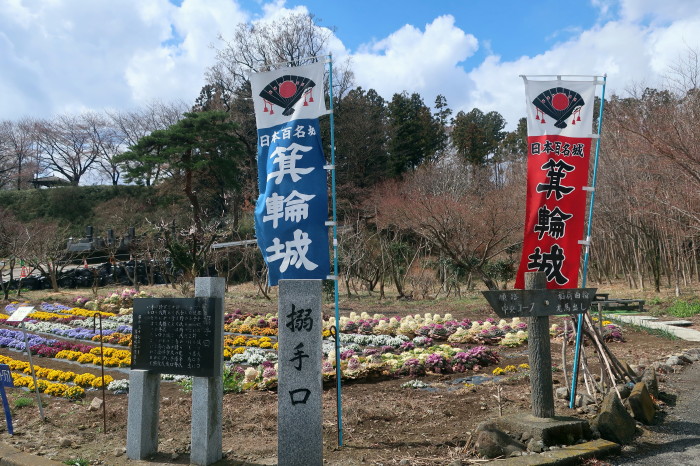 | 御前郭~稲荷郭、そして新郭~丸馬出へ堀底道を進む… | 見上げると、青空にさくら(?)と後方には山並みが見える(赤城山系?)… | |