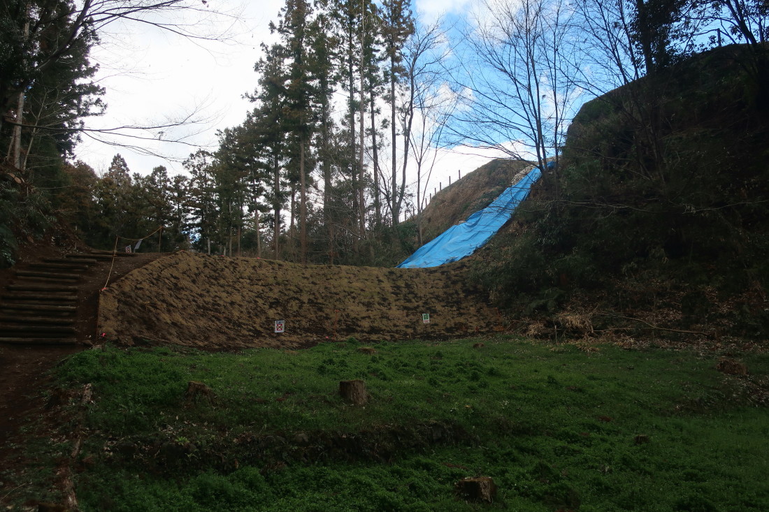 | 大堀切の土塁…2014年度に城最終時の土橋の形状に復元している。廃城後に削られた部分は森戸で復元して、発掘された石垣は地下に保存し、その上に新たに石垣を復元した。(現地説明版より) | ||
