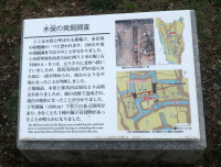 | 「本丸から蔵屋敷に出る橋の脚を立てた台で、堀はここで狭くなっている」との説明版が…ブルーシートの下の部分に橋脚の位置と思われる場所が明示されている。右の写真参照。 | ||