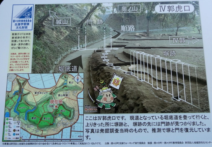 | 奥ノ山から再び倉跡の方に戻る | IV郭虎口周辺の説明図…塀跡、門跡が見つかった | |