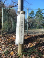 | 城跡の南側の民家方向に行き城跡の小高い丘を見る… | 少し歩いて舗装道路に出た時に見つけた案内標示柱… | |