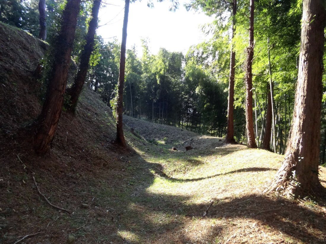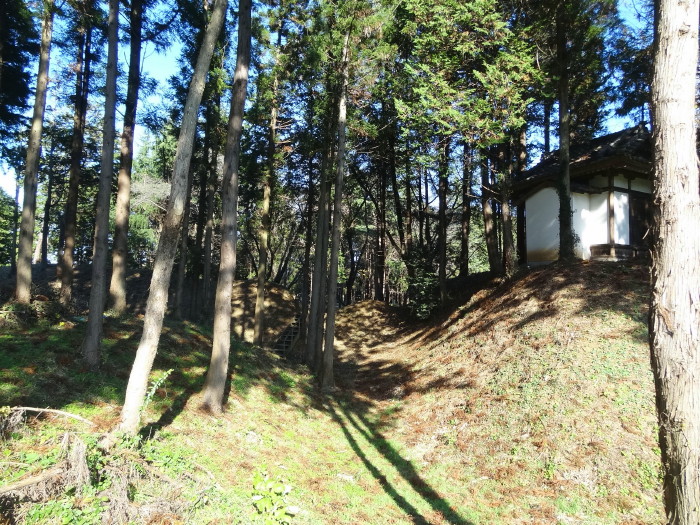 | 主郭を北側から西方にぐるりと囲む土塁…この向こうには横堀が | 城跡の南西に建つ御堂…少し高くなっており櫓台だったのか? | |