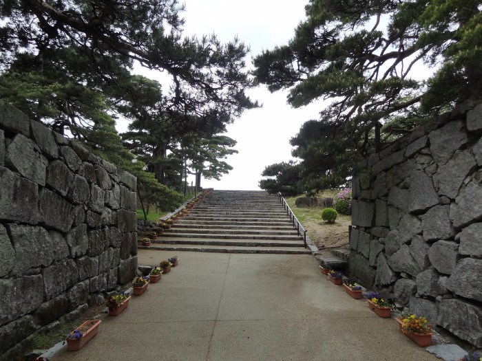 | 霞ヶ城の箕輪門へ通じる入口 城址碑の右側部に二本松少年隊群像が見える。 | 階段の右手に「史跡 二本松城跡」の碑 | ||