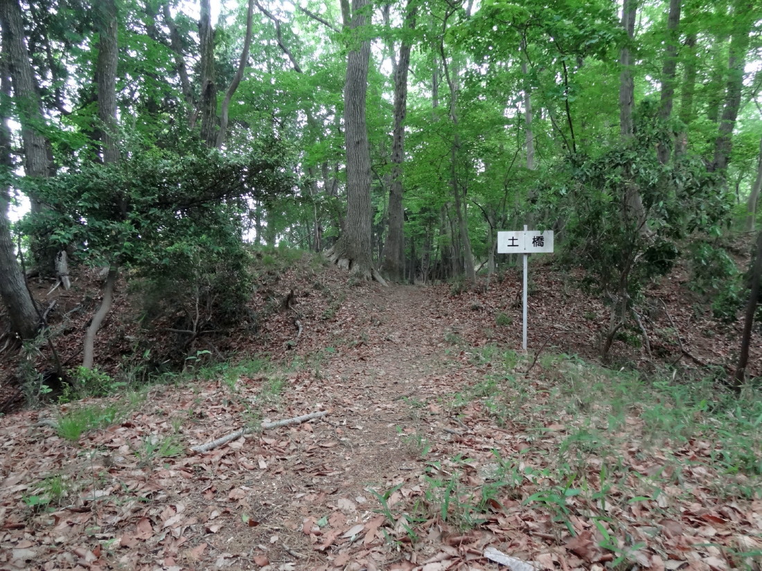 | 土橋手前の下の段(帯曲輪?)から二の丸手前の空堀・土橋のところ… | 土橋を渡り二の丸へ進む… | |