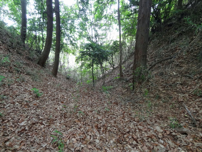 | 歩きやすい道が続く…最初の地図の①~②のところ | すぐ右上の写真の突き当りに行くと、下の写真のように、見どころ①「屈曲する空堀」となっている… | |