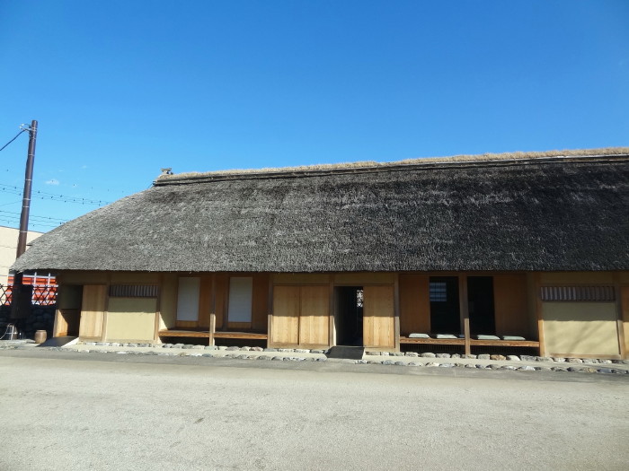 | 拾九間長屋(右の写真)の前の、復元された土塁と空堀…堀幅・深さを縮小して2006年に復元された | 北側にあった「厩(馬屋)」… | |