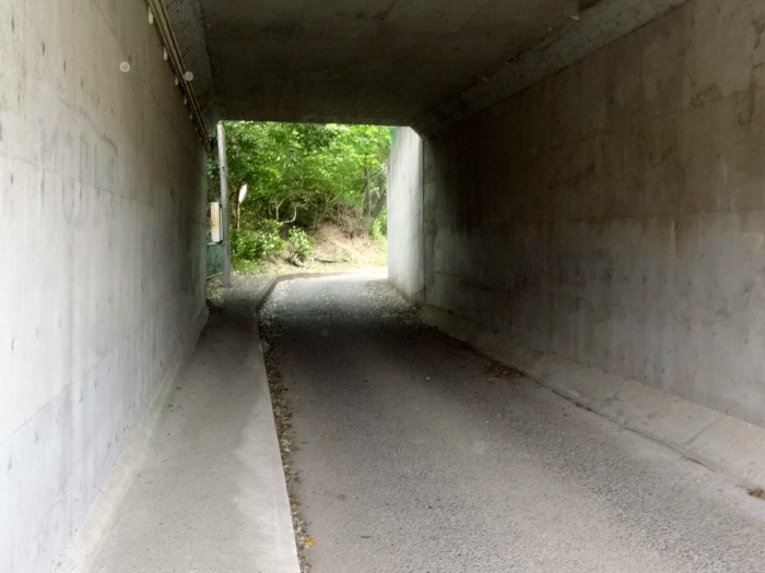 | 水の手門を右に見て、本丸方向へ来ると、空堀を挟んで本丸の高い土塁が見える。この場所に、案内板がある。 | 本丸を左に見て、東側を見ると最初に入って来たトンネルの出口が見える… | |