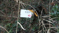 | 急に、消えかかった「城山」の黄色い道標が。ここを曲がって急峻な道へ…竪堀の跡らしい |