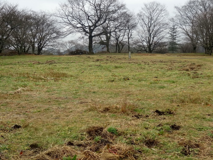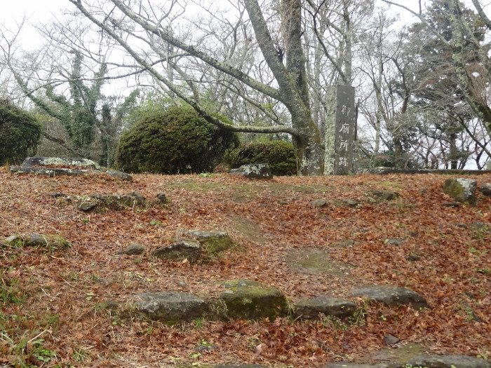 | 後方に見えるのは三重櫓台跡か?…本丸跡の標示柱 |