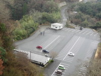 | 西の丸から北西方向を見ると、角櫓跡と読めるような標示柱が…真下を見下ろすと駐車場が見える(右の写真) |