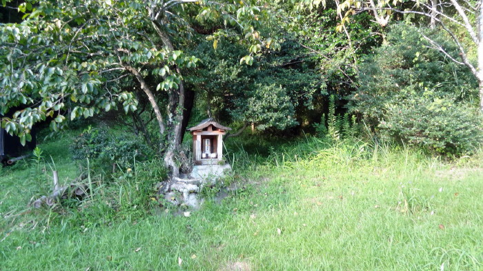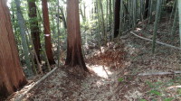 | 城跡の南側の山裾(バス通り側)に戻って、裏の山が自分の土地と言う地元の人に教えてもらい、その民家の横から山に入った。入ってすぐの場所にお社があった。その横の道を、とにかく、遺構的なものを求めてひたすら歩いた… |