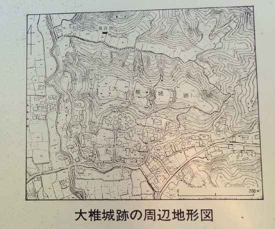 先ほどの地形図の現在地から歩いて山裾に来たところ…ここは公園のように整備がされている、ベンチもある。ここから地形図を見てまっすぐ、地図上の「大椎城跡」の文字の部分へ何とか行けないかあちこち探したが直接は無理みたいだった。 |