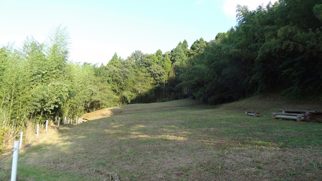 | 空堀の名残かとか、削平地だったのかとか、いろいろ想像しながら歩いたが、何ら具体的成果が得られず、ぐる〜と回って再度南側の民家のそばまで戻った。 |