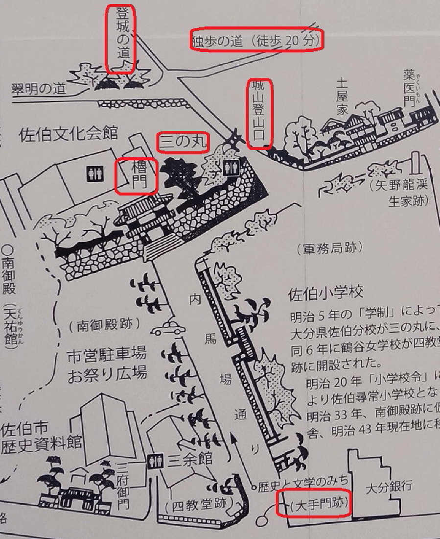 | 「明治4年ごろの佐伯藩時代屋敷図による」と記された鳥瞰図…城山登山口付近にあった案内板より… |