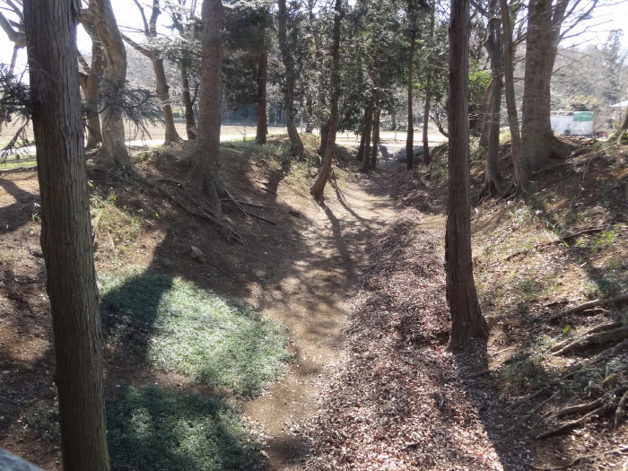 | 案内板の前の空堀…横矢が掛かっている | |||