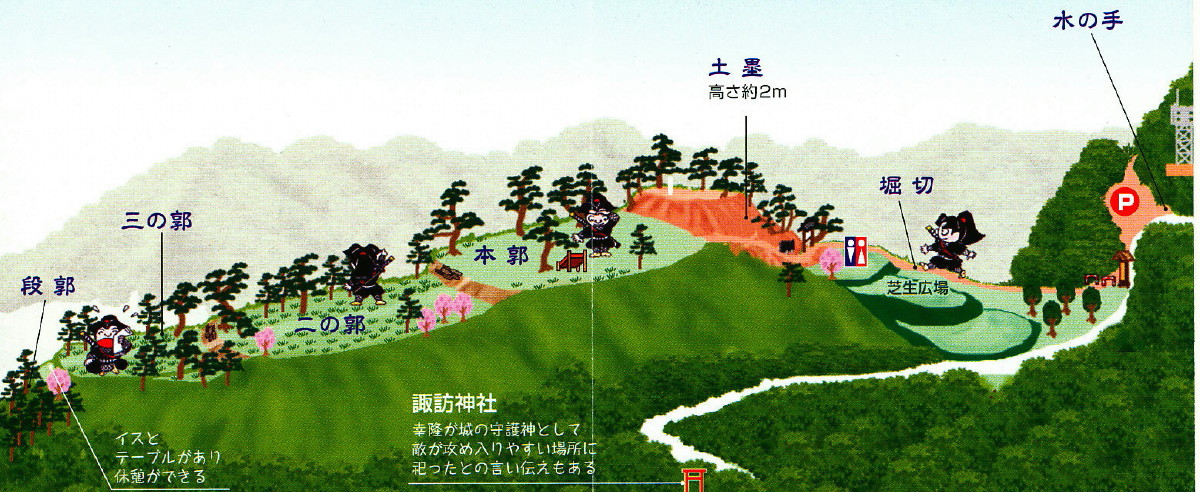 | 上田市観光課発行のパンフ「信州上田真田氏ゆかりの山城案内」より真田氏本城の部分を借用 立体表示で非常にわかりやすい 右端のPから土塁、本郭、二の郭、三の郭の順に回った!見晴らしもよいが、自然の地形を利用した巧みな築城技術がしのばれる素晴らしい山城であった! | 現地設置の案内板の平面図 等高線標示もあり左の立体図と見比べてみるとよりわかりやすいのでは | ||