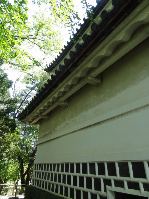 | 旧二の丸隅櫓 腰壁は瓦張り、白と黒が美しい海鼠壁で仕上げられている | 隅櫓下から塀越しに自衛隊敷地内の 三階櫓を見ようとしたが・・・ |