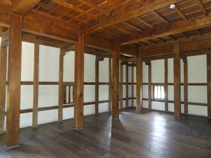 | ここから辰巳櫓へ上がる…この階段はもちろん現代のもの | 辰巳櫓入口 平成10年、秀勝入封後400年記念事業を契機に三階櫓復元の機運が高まり、平成11年度から三階櫓と辰巳櫓の復元事業が行われ平成16年6月に完成した | 辰巳櫓内部 復元に当り発掘調査をした結果、土台石の列が検出された。その内側には、直径1mほどの川原石の礎石が11個検出され、2回まで続く通し柱がのっていたと考えられるとの説明。 | ||