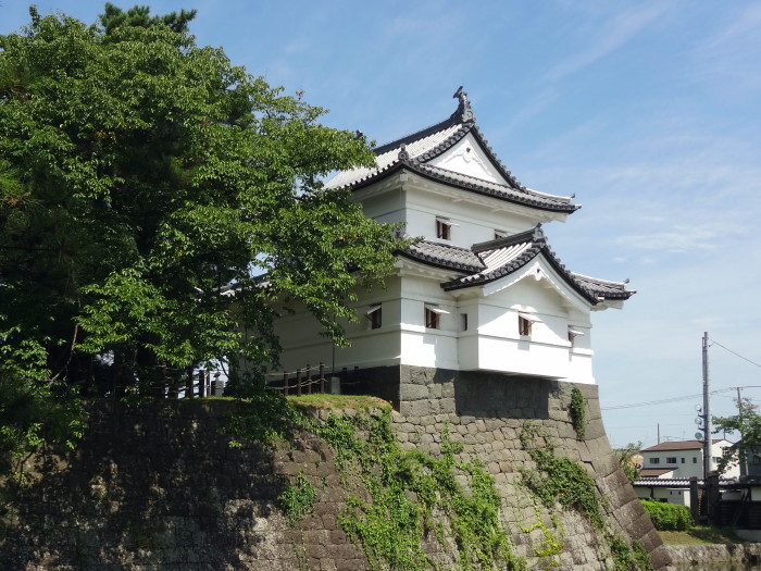| 旧二の丸隅櫓 二の丸の北部にあったが、昭和の解体修理で本丸の鉄砲櫓があった場所に移築されたため、旧二の丸隅櫓という名称になった。この隅櫓は表門と共に新潟県内で唯一、江戸時代から現存する城郭建造物で、国の重要文化財に指定されている。上の写真の土橋門手前および土塁上から撮影した。 | 旧二の丸隅櫓を見て表門方向に進む…石垣が残る。全て切込みハギのきれいな石垣 | |||