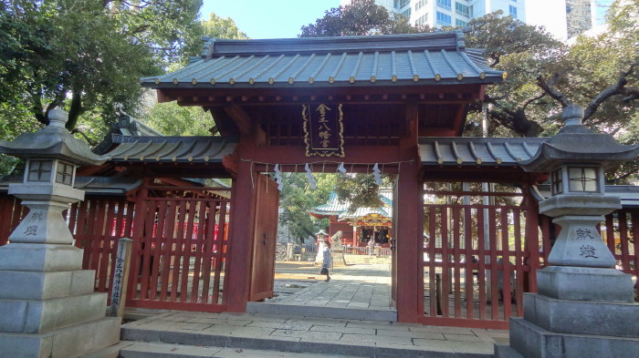 社記によると、この八幡は渋谷氏の祖、河崎基家が寛治6年(1092)に創建したといわれます。現在の社殿は、徳川家光が三代将軍に決定したとき、守役の青山忠俊が家光の乳母春日局とともに、慶長17年(1612)に造営を開始したものです。その後たびたび修理されましたが、江戸初期の建築様式をとどめている貴重な建物です。(以下省略…金王八幡神社の門の横にあった案内板より抜粋) |