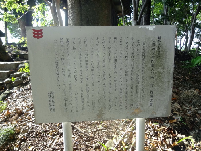 | 慈眼寺の墓地内に、「江原家の墓」…右上の写真がその石碑。右下の写真は群馬県教育委員会・高崎市教育委員会が設置の案内板 |