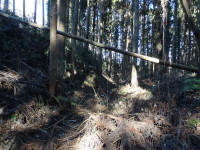 | 本丸東の空堀(最内側の堀)へ続く。最初は比較的歩きやすい。それなりに整備されているのだろう…この下の写真から右の写真に続く。左側の土塁の端に電器の配電盤のようなものが見えるが、これは縄張図のFの位置。土塁上を歩いた際の写真に同じ配電盤が見える。 |