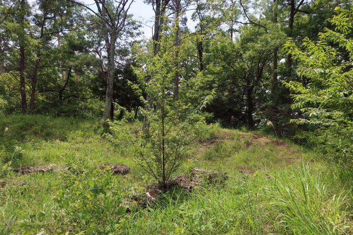 | 上の写真の続きで、右(南)側の土塁を見て、東方向へ進む… | ||