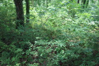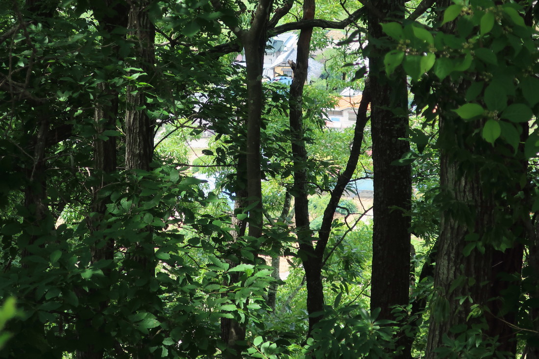| 三日月堀から、その先(東側)にある筈の「作事用陣屋」を目指して、帯郭的な場所を通り探したが…結局特定できないまま、下の県道に戻ってきた。 | ||