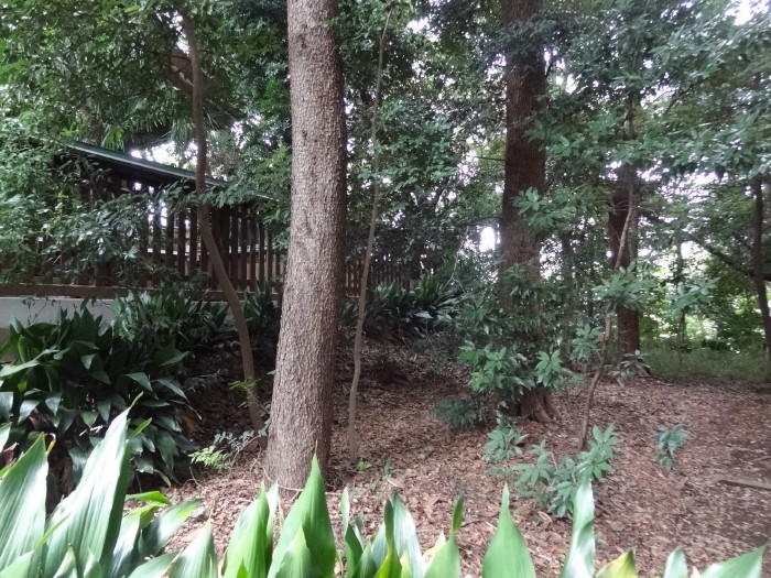 | 郭2の端に来た…奥の主郭(現マンション)の手前には少し平地が。ここまでが神社の領域となる。土塁上から撮影…縄張図のB之部分ですかね |