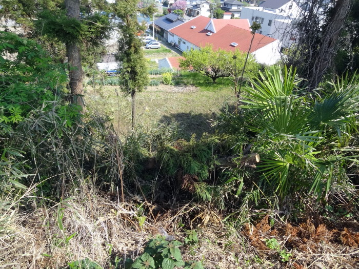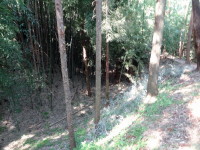 | 本丸から続く笹郭の突端にある櫓台的な場所…石積みが見えるがロープが張られ入れない | 東側の南郭(畑になっており確認できない)との間の堀のように見える… | 笹郭から、本丸を見下ろす… |