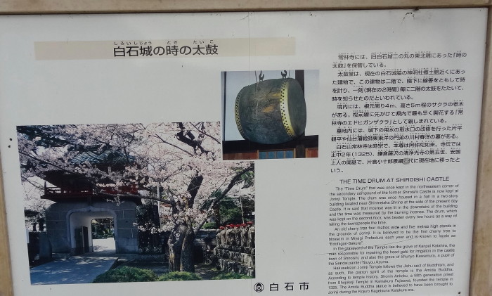 | 常林寺…ここには白石城旧二の丸の東北隅にあった「時の太鼓」を保管している由。白石山常林寺は時宗で、正中2年(1325)、鎌倉藤沢の清浄光寺の第五世、安国上人の開基で、片倉小十郎景綱時代に現在地に移ったとされている。 |