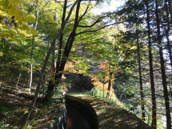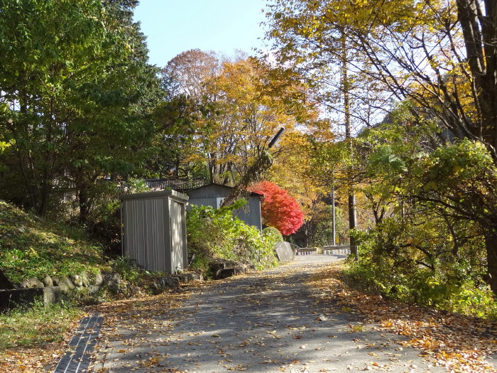| ピンクのリボンを頼りに降りてきたら、麓の、側溝があるところに出た。もちろんこれは近代のもの…この辺でも紅葉が進んでいるようだ。この下は「根小屋神社」だった。つまり最初に登ってきた登山ルートではなかった。 |