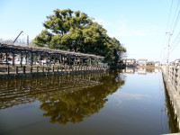 | 境内を出て西側に出ると、ここには見事な水堀が残る… | 境内は工事中?(初詣用のテントを解体しているようにも見える。…下の写真)屋台も出て賑わっていた | |