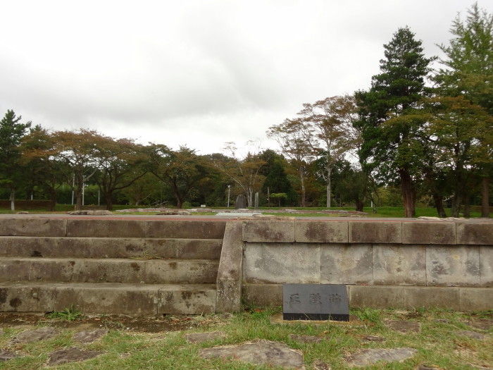 | 政庁南門跡の説明と推定復元図 | 西南建物跡の標識 | 政庁南門跡の礎石 | ||