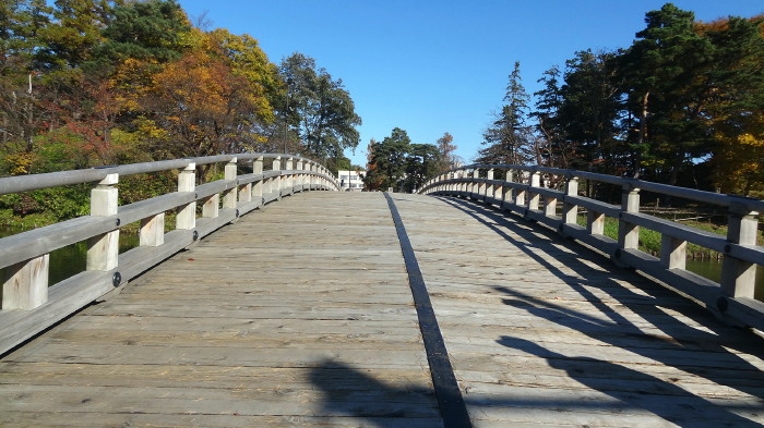 | 極楽橋から三重櫓を見る… | 三重櫓に展示の資料によると、「御橋幅 三間に弐拾三間」と記される見事な太鼓橋でした、との説明がありました。 | |