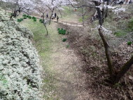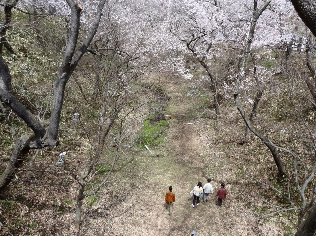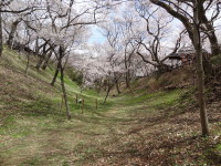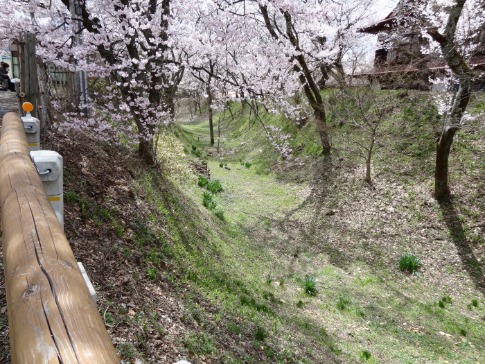 | 南曲輪の桜、桜 | 本丸方面への案内板が見える | 南曲輪から本丸跡への 土橋上から撮影の空堀 |