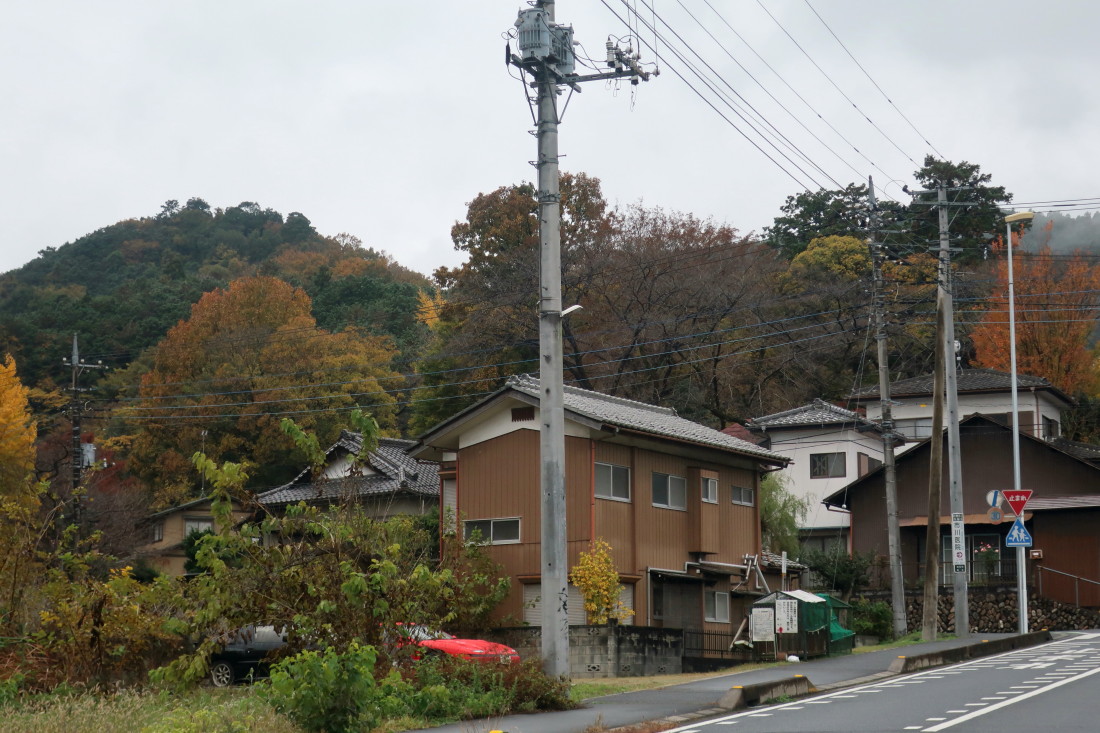 | 越生駅前広場にあった案内図より… | 「越生町商工会館」の横を通り西方向へ…前方の山が城跡のあるところだろう | |