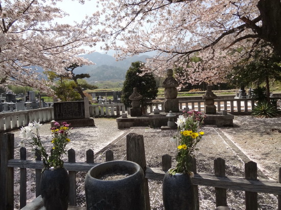 | 上の写真の、五輪塔の3体部分をズームで撮影… | 神社境内の桜がきれいだった…後方に見えるのは「武田家累代御霊殿」 | |