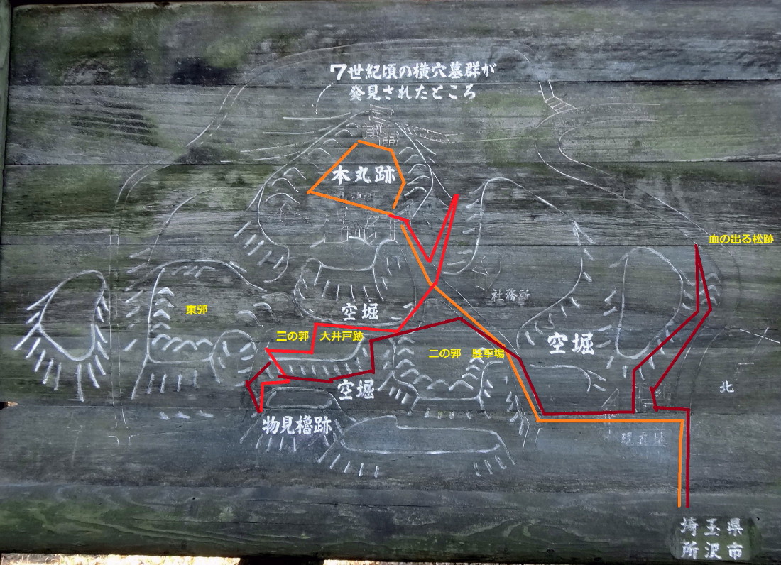 | 右上の写真の「城跡入口」の標示の左にある案内板より抜粋、拡大した。また、回ったルートを、オレンジ色→朱色→えんじ色の直線で表示(加筆)した。黄色で表示の名称は社務所横にあった説明より… |
