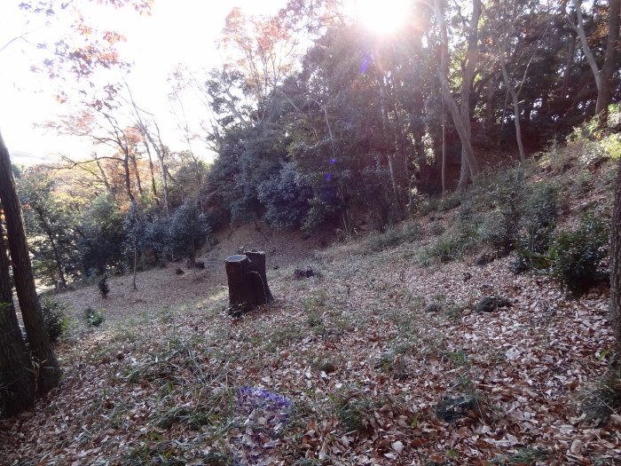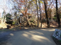 | 鳥居の手前で、右側(南東)の空堀を見る…奥に東所沢病院の建物が見える |