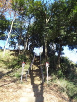 | 物見櫓跡の標示柱を見て矢印方向へ行き、右の写真の斜面を登る… |