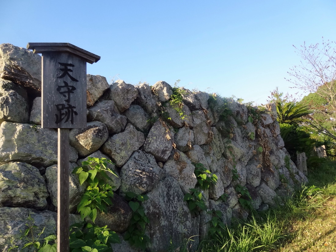 | 本丸の北端部にある天守跡…右の写真は石階段を上がり天守跡全体を見下ろした |