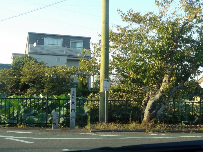 虎口を出てすぐ右側(東側)の玉城中学校グランド前に「田丸城址・三の丸(井戸水源)との標示柱… |