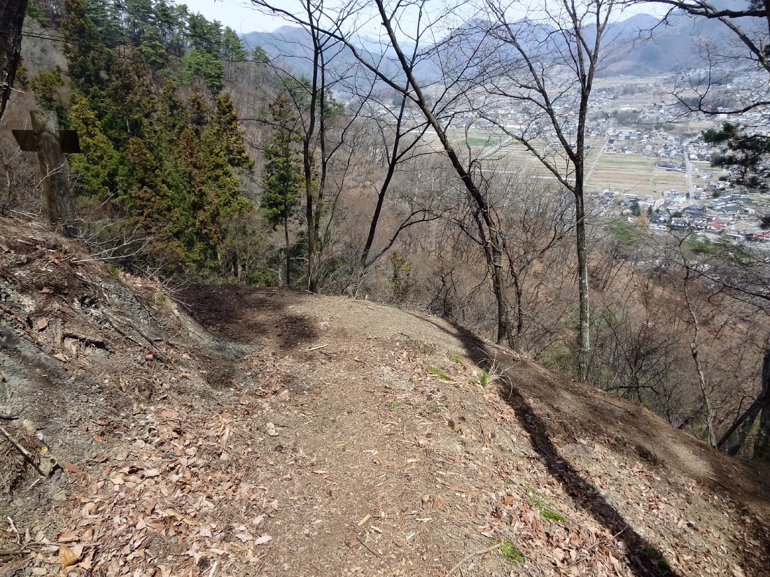 | 上田市街方向を見る…米山城主郭から。 | 最初に入って来た主郭の東屋を振り返る… | 迂回路を通って砥石城へ…「切岸」との案内標示が | |