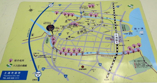 | JR常磐線土浦駅西口にあった案内マップ。亀城公園まで歩いて、先ず公園内の各遺構及び土浦市立博物館を見て、土浦小学校前にある大手門跡~東光寺境内の土塁~南門跡を巡って、土浦駅に戻るコースを辿った。 |