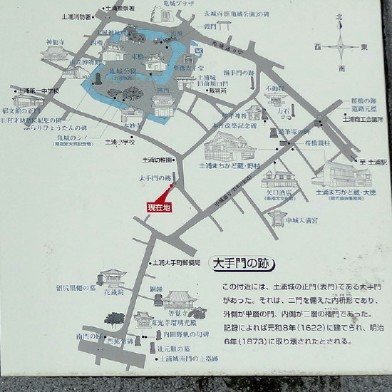- 土浦城は、一名亀城(きじょう)ともよばれ、平城で、幾重にも巡らした濠を固めとする水城であった。城は、城跡に指定されている本丸・二の丸を中心に、三の丸・外丸のほか、武家屋敷や町家を含み、北門・南門・西門を結ぶ濠で囲む総構えの規模をもつものであった。江戸時代の建物としては、本丸表門の櫓門・裏門の霞門、二の丸と外丸の間に移建された旧前川門(高麗門)があり、復元された建物としては、東櫓・西櫓がある。戦国時代には、城主は若泉氏、信太(しだ)氏、菅谷(すげのや)氏と変遷したが、織豊期(しょくほうき)には結城秀康の支配下に入った。江戸時代の城主は松平(藤井)氏、西尾氏、朽木氏、土屋氏、松平(大河内)氏と替わったが、土屋政直が再び入城して、以後明治維新にいたるまで土屋氏(9万5000石)の」居城となった。明治以降、本丸跡は土浦県庁、新治(にいはり)県庁、新治郡役所、自治会館などに利用されたが、現在は二の丸跡の一部とともに亀城公園となっている。(土浦市教育委員会が現地に設置の案内板「土浦城跡および櫓門」より)