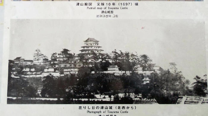 室町時代、嘉吉年間(1441-1444)美作国の守護大名であった山名教清が、一族の山名忠政に鶴山に鶴山城を築かせたのが最初。しかし応仁の乱で山名氏が衰退したのちに廃城となった。江戸時代、1603年に森忠政が18万6千石で入封し津山藩が立藩。同年、現在見られる津山城の建設に着手。また、城地の名前を「鶴山」から「津山」に改めた。1616年、13年の歳月をかけて、5層の天守を戴き、櫓や城門など80余棟が建ち並ぶ大規模な近世城郭が完成した。1697年、森氏断絶、安芸国広島藩主・浅野綱長の預かりとなる。1698年、松平宣富(越前家)が越後国高田藩より10万石で入封。1809年、火災により本丸御殿焼失。明治6年廃城令により競売に付された。明治7年―明治8年、天守、櫓などの建物が悉く破却される。(資料 ウィキペディアより抜粋・編集)