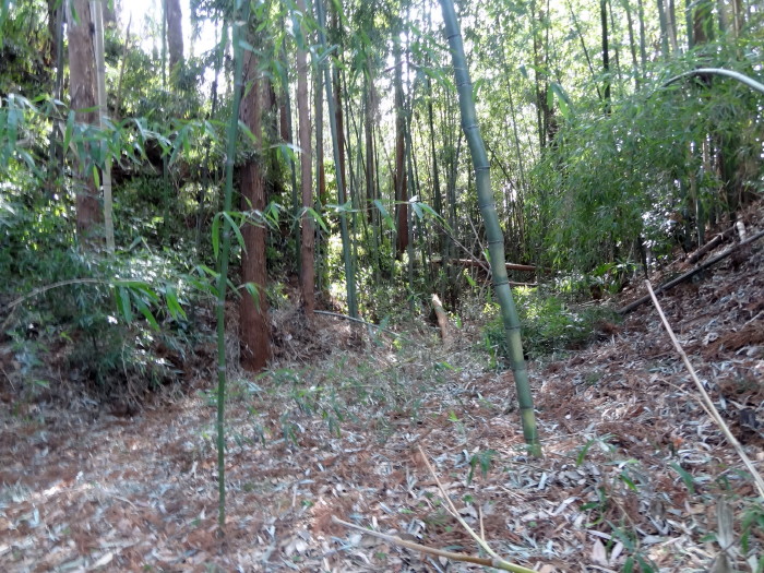 | 堀底を少し歩くとこのように倒木や竹林が邪魔をする…本来は見事な空堀であろう。 |