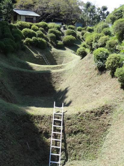 | 障子掘り…被覆して芝生を張り保存されている。従い、浅いし上部の幅も狭いようだ… | ||