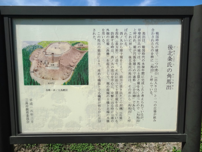 | 西櫓台へ上がる通路… | 掘立柱建物跡の標示…床面と思われる範囲を標示している | 西ノ丸から障子掘りを超えて突き出た部分にあったとされる角馬出の説明… |